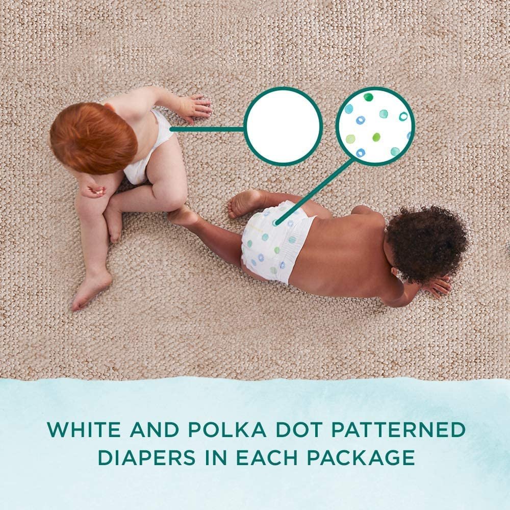 - 148 size 4 diapers for babies 22-37 lbs (10-17 kg); Each pack contains both solid white and polka dot print