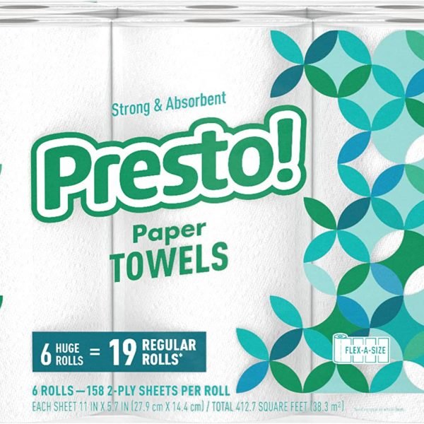 Amazon Brand – Presto! Flex-a-Size Paper Towels, 158-Sheet Huge Roll, 6 Count (Pack of 2), 12 Huge Rolls = 38 Regular Rolls