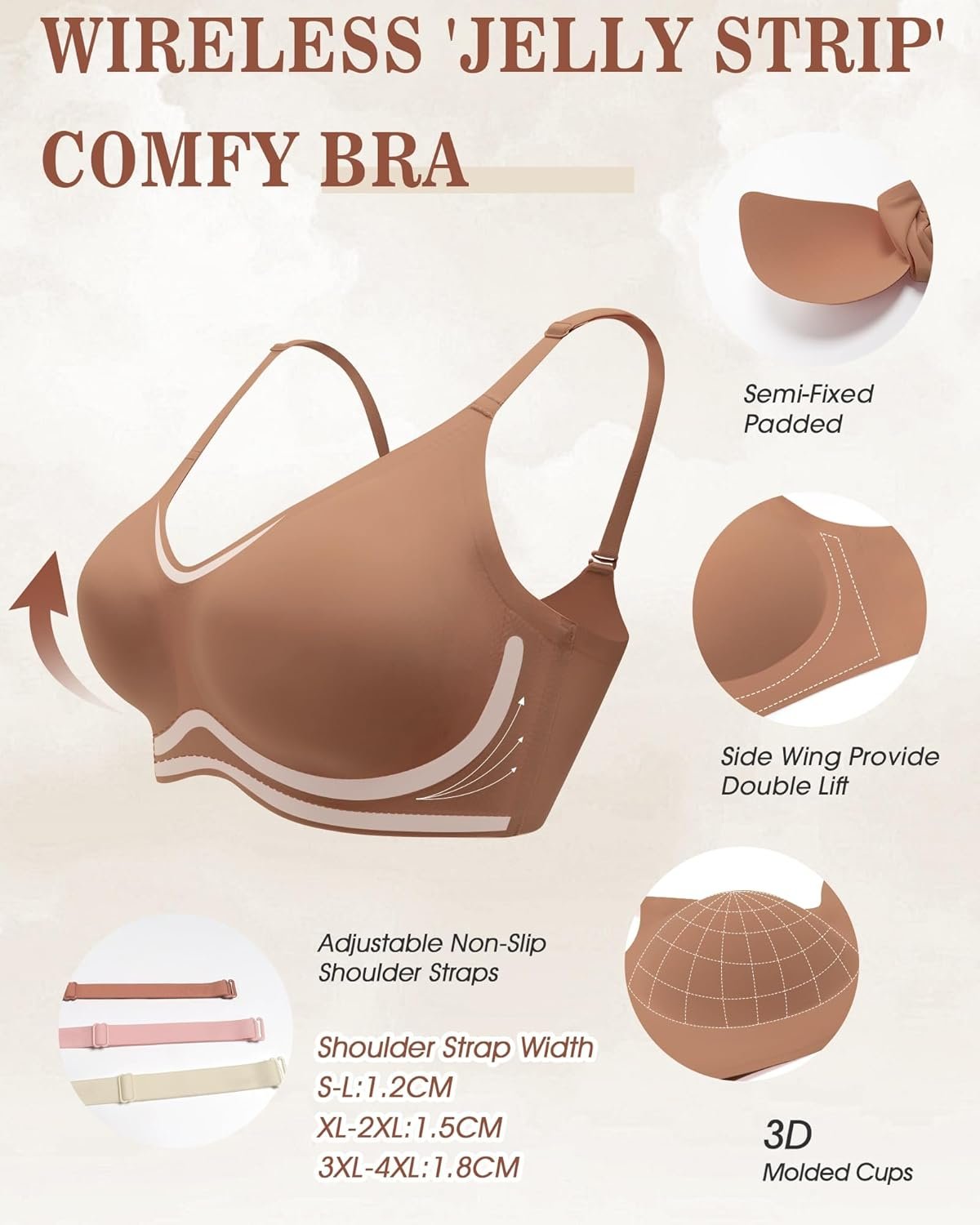 - 【360°Jelly Strips Support】Our push up padded bra features a W-shaped liquid jelly strip that lifts and shapes your chest from the bottom and sides towards the center, creating a full shape. Back smoothing bra can fully support your breasts, super elastic, so that you won’t feel tight and your breasts won’t sag at the same time without the discomfort of a traditional underwire bra.